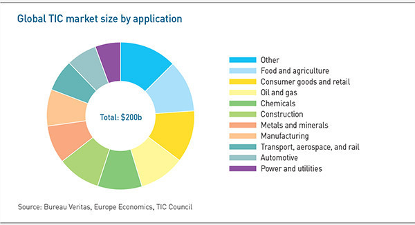 Globally, the testing, inspection, and certification (TIC) sector is worth around $200 billion and set to hit $260 billion by 2025, according to a report by Europe Economics and TIC Council that was issued immediately prior to the pandemic. Food and consumer goods are the largest categories, with each currently estimated at $23 billion. Independent labs, currently one-third of the market, are gradually displacing in-house operations and government incumbents.