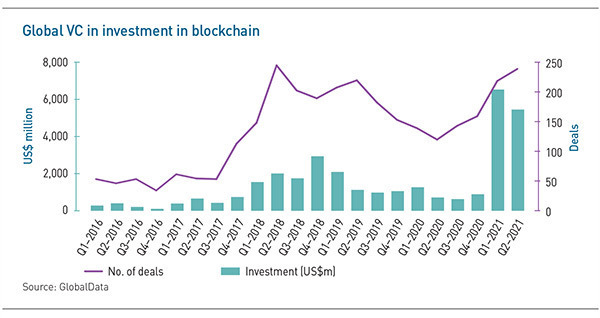 Global VC investment in blockchain companies averaged $1.1 billion per quarter throughout 2019 and 2020 before spiking to $6.5 billion and $5.4 billion in the first and second quarters of 2021, according to GlobalData. There was an average of 164 deals per quarter during 2019 and 2020, compared to 227 per quarter in the first half of 2021.