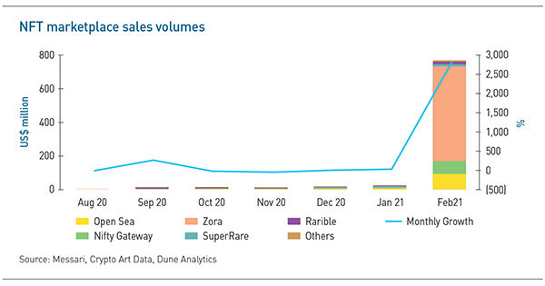 Less developed but potentially broader applications of NFTs are also starting to come to light. The technology is expected to allow individual creators, influencers, and online media personalities to create their own game-like economies. E-sports and fashion are considered likely hotspots.