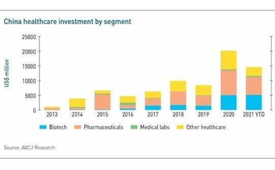 Numerous data points track China's drug development boom. PE and VC investment in healthcare reached a record $20.2 billion in 2020, more than the previous two years combined. Commitments to biotech rose 3.5-fold to $5 billion, while pharmaceuticals more than doubled to $8.5 billion. In 2021 to date, these segments have received $5.1 and $6 billion, respectively.