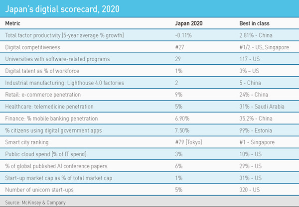 According to McKinsey & Company, a mix of developed and developing countries represent best-in-class when it comes to digitization, but Japan is never among them. For example, only 9% of Japanese retail is online (versus 24% in China); digital talent represents 1% of the workforce (3% in the US); penetration of mobile banking is 6.9% (35.2% in China); and telemedicine penetration is 5% (31% in Saudi Arabia).