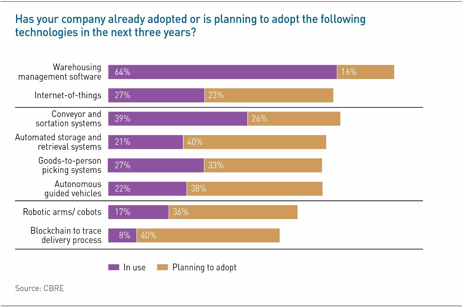 According to a recent survey of warehouse occupiers by CBRE, the biggest expansion areas in terms of technology uptake in the coming years will be automated storage and retrieval systems and blockchain for tracking the movement of goods. The next most in-demand upgrades include autonomous vehicles, IoT, robotic arms, and goods-to-person picking.