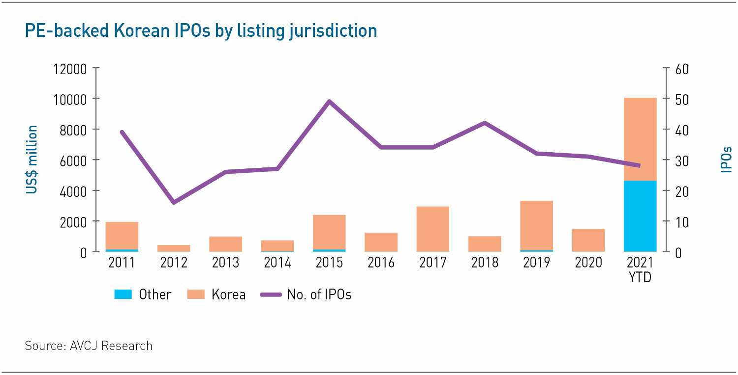 Recent activity for private equity-backed companies also includes game developer Krafton and Kakao Pay raising about $3.8 billion and $1.3 billion, respectively, in domestic IPOs. Hybe, the manager of K-pop band BTS, formerly called Big Hit Entertainment, raised about $840 million in a 2020 IPO and currently has a market capitalization of KRW15.2 trillion ($13 billion).