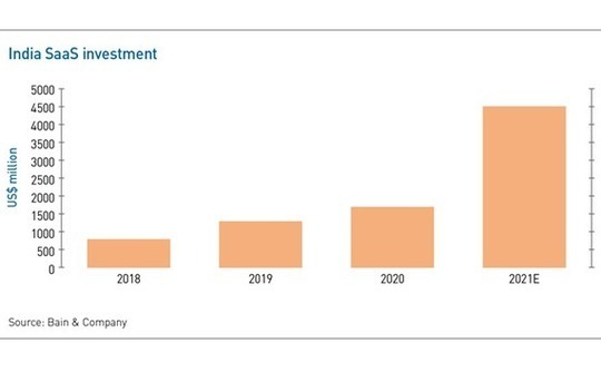 The question is at what point do valuations outstrip what is realistically achievable. Investment in Indian SaaS is on course to reach $4.5 billion in 2021, up from $1.7 billion last year, according to Bain & Company. Growth was driven by a rise in the number of larger deals, classified as $50 million and above.
