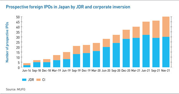 The standout cross-border listing to date is Appier, a Taiwan-founded advertising technology company that received significant global VC investment before raising $271 million in a Tokyo IPO in May. Appier listed via corporate inversion (CI), effectively becoming a Japanese company. Three foreign IPOs are tipped to come to market in 2022, two JDRs and one CI, one of which is a unicorn.