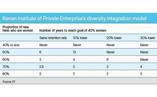 According to a diversity integration model created by the Kenan Institute of Private Enterprise, an affiliate of the University of North Carolina's business school, it would take six years for a GP to achieve 40% female representation if 50% of new hires each year are women, assuming the same retention rate for each gender. When females account for 80% of recruits, it falls to two years.