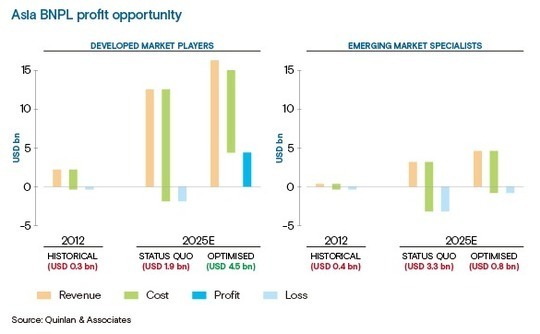 In Asia's mature economies, the BNPL industry could swing from an overall loss of USD 300m in 2020 to a profit of USD 4.5bn by 2025 if companies make certain corrections to the model, according to Hong Kong's Quinlan & Associates. This includes mainland China.