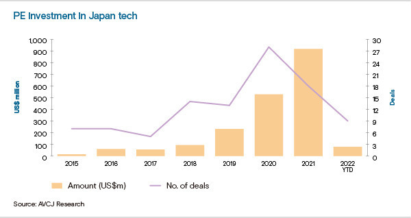 Growth-stage private equity investment, excluding VC, in Japanese technology companies increased exponentially between 2015 and 2021, when it hit USD 917m, according to AVCJ Research. This compares to USD 528m and USD 231m in the prior two years.