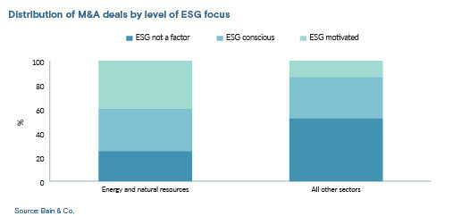It's hard to pin down these expectations by industry or sector, although the industrials space appears to be taking a lead role. According to Bain & Company, on average 40% of energy and resources companies considered ESG a "motivating" factor in M&A versus 14% for all other sectors. Only 25% of energy and resources companies said ESG was not a factor versus 52% for the rest of the field.