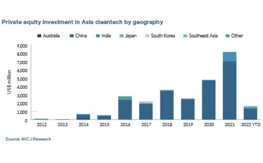 EV investment has risen from negligible in 2015 to USD 3.5bn last year, with more than 90% of that capital targeting China, according to AVCJ Research. The EV value chain – from batteries to smart cockpits – is harder to quantify, but it helped drive investment in Asia cleantech to USD 1.4bn in 2020 and USD 4.6bn in 2021. Prior to that, the USD 700m threshold has been crossed only three times.