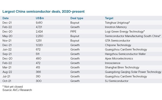 By 2020, PE and VC players were looking for ways to leverage this trend. Investment in the semiconductor industry hit USD 7.16bn, up from USD 230m in 2019. It held steady at USD 6.7bn last year, although this doesn't include USD 9.4bn committed to the restructuring of Unigroup, and it has since kicked on. Nearly USD 9.5bn was put to work in the first eight months of 2022.