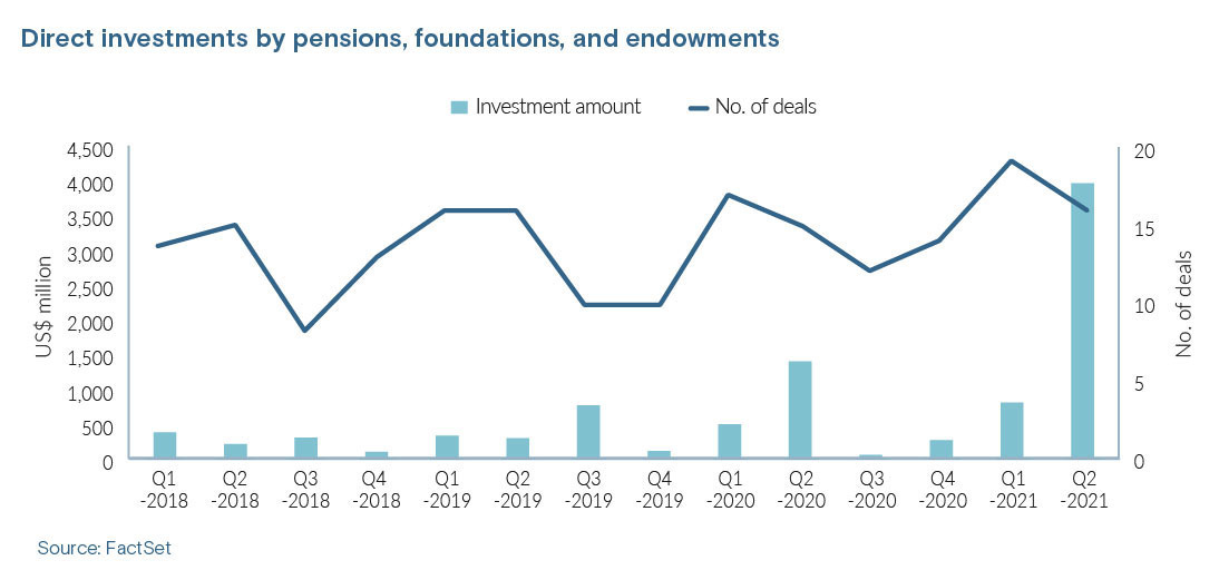 Global pensions, foundations, and endowments have similarly mobilised, deploying USD 4bn in the second quarter of 2021, according to FactSet. That's more than the prior six quarters combined. Standout moves in Asia included Robert Bosch and Novo Holdings co-leading rounds of USD 500m and USD 200m, respectively, for Chinese autonomous driving supplier Momenta and Singapore's Esco Lifesciences.