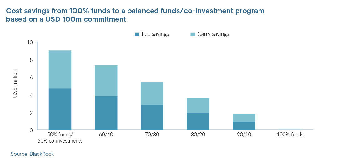 A study by BlackRock helps explain why an industry push toward a balanced PE programme (50:50 co-invest and funds) persists. Assuming a gross deal level return of 2x, fund management fees of 2%, co-invest fees of 0.75%, and 20% deal-by-deal carry, a balanced PE programme will deliver LPs USD 9m in fee and carry savings on a USD 100m deal versus USD 3.6m in fee and carry savings in a 80:20 split.