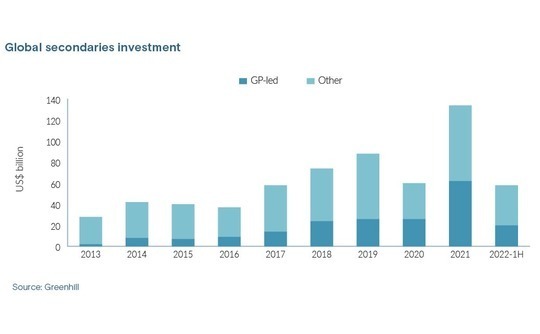 Secondaries investors put USD 58bn to work in the first half of 2022, according to Greenhill, which expects the full-year tally to roughly match the USD 134bn recorded in 2021. LPs under selling pressure was the story of the first six months. This contributed to the GP-led share of overall volumes falling to 34% from 46% last year.