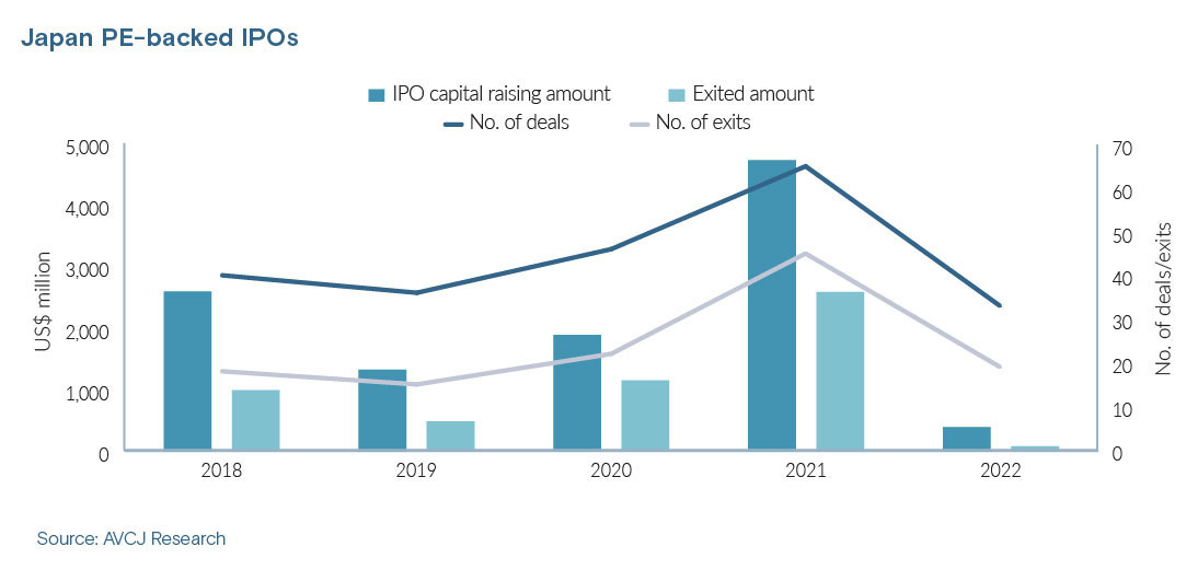 Offerings by PE-backed companies have generated proceeds of USD 78.9m so far this year, compared to USD 2.6bn in 2021 and USD 1.1bn in 2020. The 2022 total has come from 19 IPOs, all on the Tokyo Stock Exchange's start-up boards. Last year there were nine liquidity events via IPO across the main and JASDAQ boards. There were 36 on the start-up board.