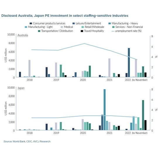 Suffering the most acute labour shortages in the region does not seem to have rattled private equity in Australia and Japan. Both markets have enjoyed robust fundraising in recent years, with deployment continuing apace. While portfolio companies are feeling the pressure, there's little expectation it will translate into weaker returns.