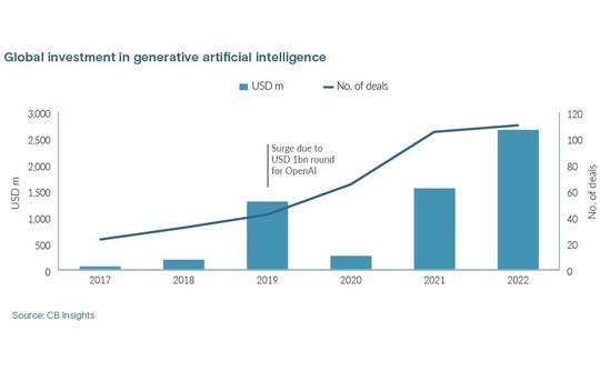 Global investment in generative AI hit a record USD 2.6bn in 2022, according to CB Insights, up from USD 1.5bn in 2021 and USD 271m in 2020. It topped USD 1bn in 2019 but Microsoft's first commitment to OpenAI accounted for the bulk of that.