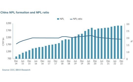 As Chinese banks have been pressed to enforce discipline around bad loans, the ratio of NPLs versus total loans has trended down from around 2% as of end-2020 to 1.6% as of end-2022, according to CEIC and BBVA Research. During this period, the total amount of NPLs disposed of by local banks scaled from about CNY 2.7trn (USD 381bn) to CNY 3trn.