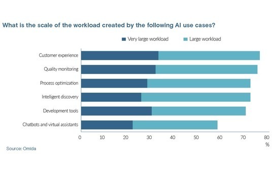 According to a recent survey by UK-based technology consultancy Omdia, 76% of global enterprises consider the scale of their AI workloads to be large or very large in customer experience functions. That figure is 75% for quality monitoring, 72% for process optimisation, and 58% for chatbots and virtual assistants.