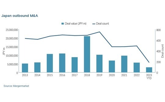 Excluding 2018, annual average deal flow for 2013-2022 was JPY 8.2trn, according to Mergermarket, with Blue Yonder part of the class of 2021. The drop-off to JPY 5.7trn in 2022 and to JPY 2.9trn for 2023 to date is meaningful but not as severe as those in global or Japanese domestic M&A. This would appear to confirm advisors' claims of continued strong demand for overseas assets.