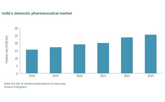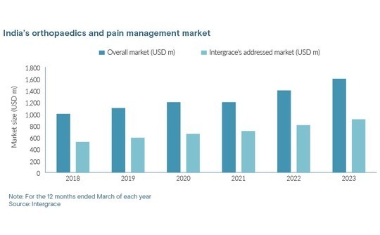 India’s domestic pharmaceutical market was worth USD 25.5bn in the 12 months ended March 2023, having posted compound annual growth (CAGR) of 10% since 2018. The orthopaedics and pain management segment hit USD 1.6bn last year, with CAGR of 11% and Integrace’s addressable market was estimated at USD 907m, with a CAGR of 12%.