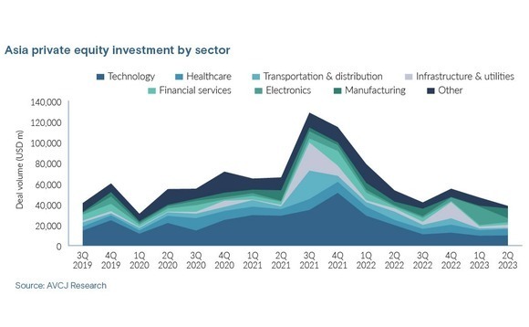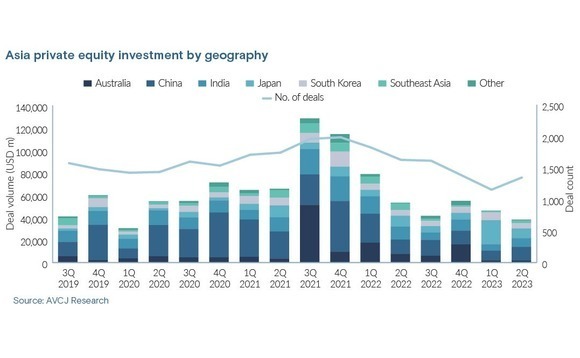 In the first three months of 2023, Toshiba accounted for one-third of overall deal volume, narrowing the drop-off from the previous quarter. Without it, buyout activity would have hit a three-year low, according to AVCJ Research. Fast forward to the second three months, JSR contributed 18% of the USD 38.4bn regional total. Without it, buyouts would have reached a seven-year low.