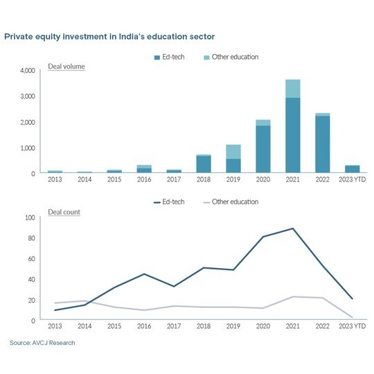 Private equity was only too willing to ride the wave. Investment in India's education sector surpassed USD 1bn for the first time in 2019, according to AVCJ Research. Over the next three years, nearly USD 8bn was put to work, with ed-tech accounting for more than four-fifths. Byju's raised USD 1bn in 2022 alone, hitting a valuation of USD 22bn. Unacademy and Vedantu also achieved unicorn status.