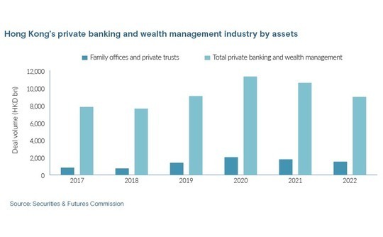 However, Hong Kong's broader financial services industry, with greater strength in areas like capital markets, supported a total headcount in asset and wealth management of more than 54,000 in 2022. There were 10,300 people working in private banking and wealth management specifically. AUM for the segment reached HKD 10.6trn in 2021, of which HKD 1.8trn was held by family offices and private trusts.