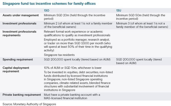 In July, qualification criteria for schemes through which family offices can obtain an income tax exemption – fund structures known as 13O and 13U – were heightened. The minimum assets under management (AUM) threshold doubled to SGD 20m (USD 14.7m) – previously, family offices had a two-year grace period in which to get there – and MAS said this level must be maintained for the life of the fund.