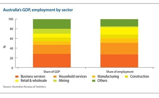 Providing 70% of Australia's GDP, the services sector has a strong domestic bedrock. However, Paul Bloxham, chief economist for Australia and New Zealand at HSBC, sees a significant shift in export-driven services. Three years ago, the balance of services imports and exports was a half percentage point drag on GDP growth; now it is responsible for one percentage point of the country's 2.5% GDP growth.