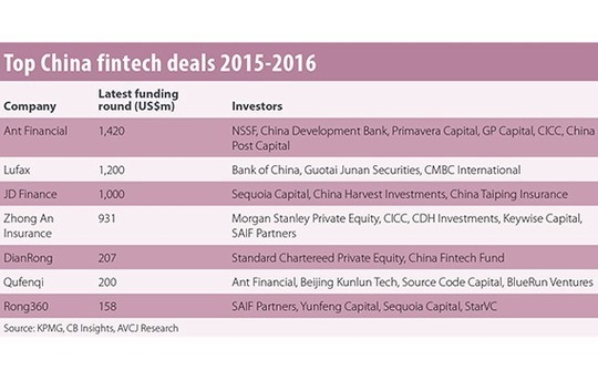 Indeed, the $2.7 billion cited in the KPMG report was highly concentrated in a number of mega deals each worth more than $100 million. Since the start of 2015, the largest investments have focused on companies with links to traditional financial institution and large internet players. They included Ping An Insurance-backed P2P lending platform Lufax, Alibaba's Ant Financial, JD.com's JD Finance, and Zhong An Insurance, which was set up by the founders of Alibaba and Tencent.