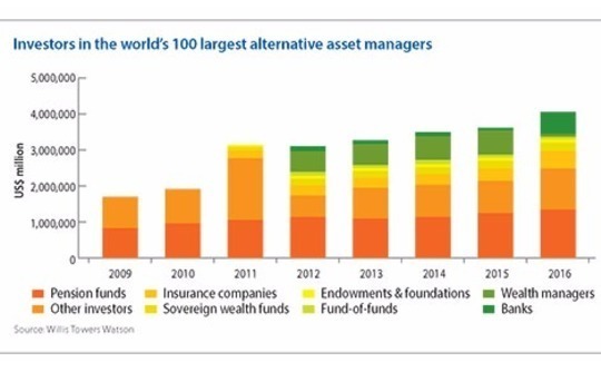 It should come as little surprise that institutional investors are piling more capital into alternatives than ever before – the low-interest rate environment has sent the search for returns into new asset classes. This was the context for Willis Towers Watson's latest global alternatives survey finding that the top 100 managers had $4.01 trillion in assets last year, up from $3.61 trillion in 2015.
