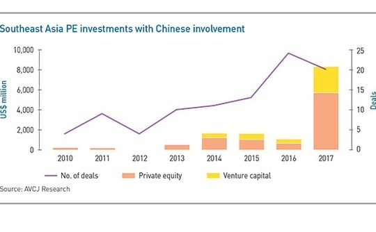 Similarly, there have been nearly 90 deals in the region that featured Chinese PE investors. It is worth noting that the 2017 total of $8.27 billion is inflated by the privatization of Singapore-listed Global Logistic Properties, a Singapore-listed company with substantial interests in China.
