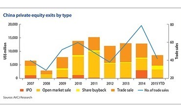 AVCJ Research has records of 79 trade sales in 2014 - an all-time high - with total proceeds coming to $5.2 billion. So far this year, 42 trade sales have generated $3.9 billion, beating the IPO and open market sale numbers on both counts.